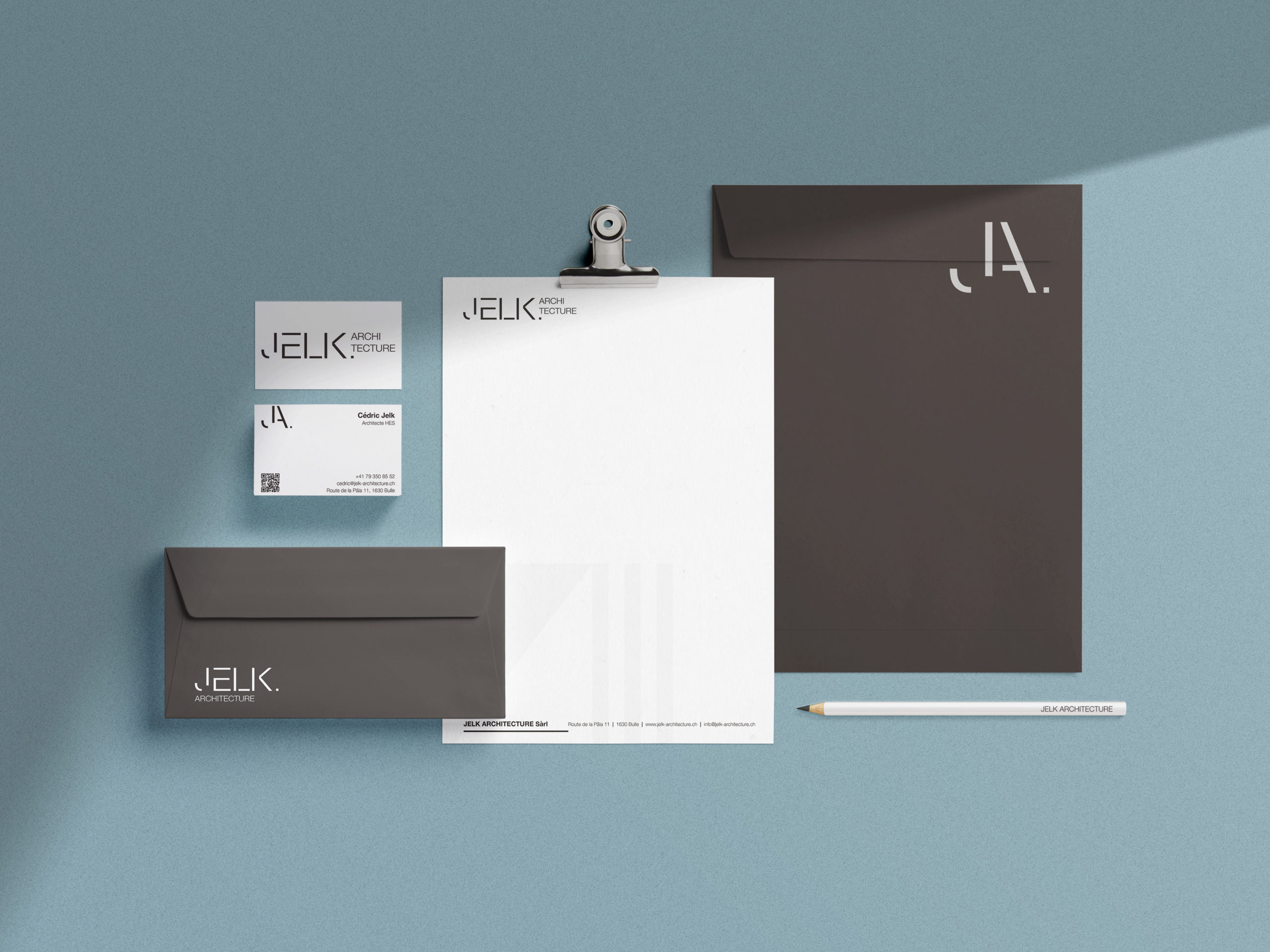 Chaque élément graphique a été conçu pour refléter l’approche architecturale du bureau : une écriture visuelle sobre, maîtrisée et contemporaine.